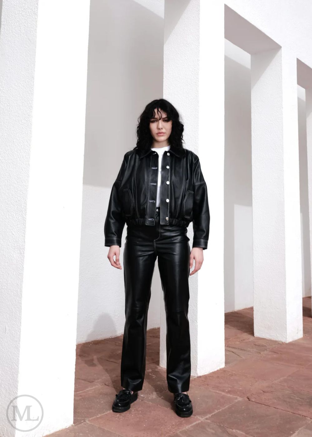 The Nico is a bold take on the bomber classic — cropped and crafted from buttery-soft lambskin leather. Featuring a structured silhouette with an elasticized hem, button-up front, and contrast stitch details, it channels a laid-back attitude with elevated design. Its smooth polyester lining and relaxed fit make it perfect for everyday wear, while the statement stitching and sleek finish bring an edge to minimal looks. Style it with leather pants or denim for effortless downtown cool.