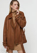 The Sabine redefines the biker silhouette with a refined nubuck leather finish in a caramel brown. Designed for a statement look, this oversized jacket features a double-breasted zip front, gold-tone hardware, and adjustable belted cuffs and hem for a customizable fit. The luxuriously soft nubuck exterior offers a matte, velvety texture, while the minimalist lining ensures a lightweight feel ideal for transitional weather. Perfect for layering over knits or dresses, Sabine brings effortless sophistication to a timeless biker style.